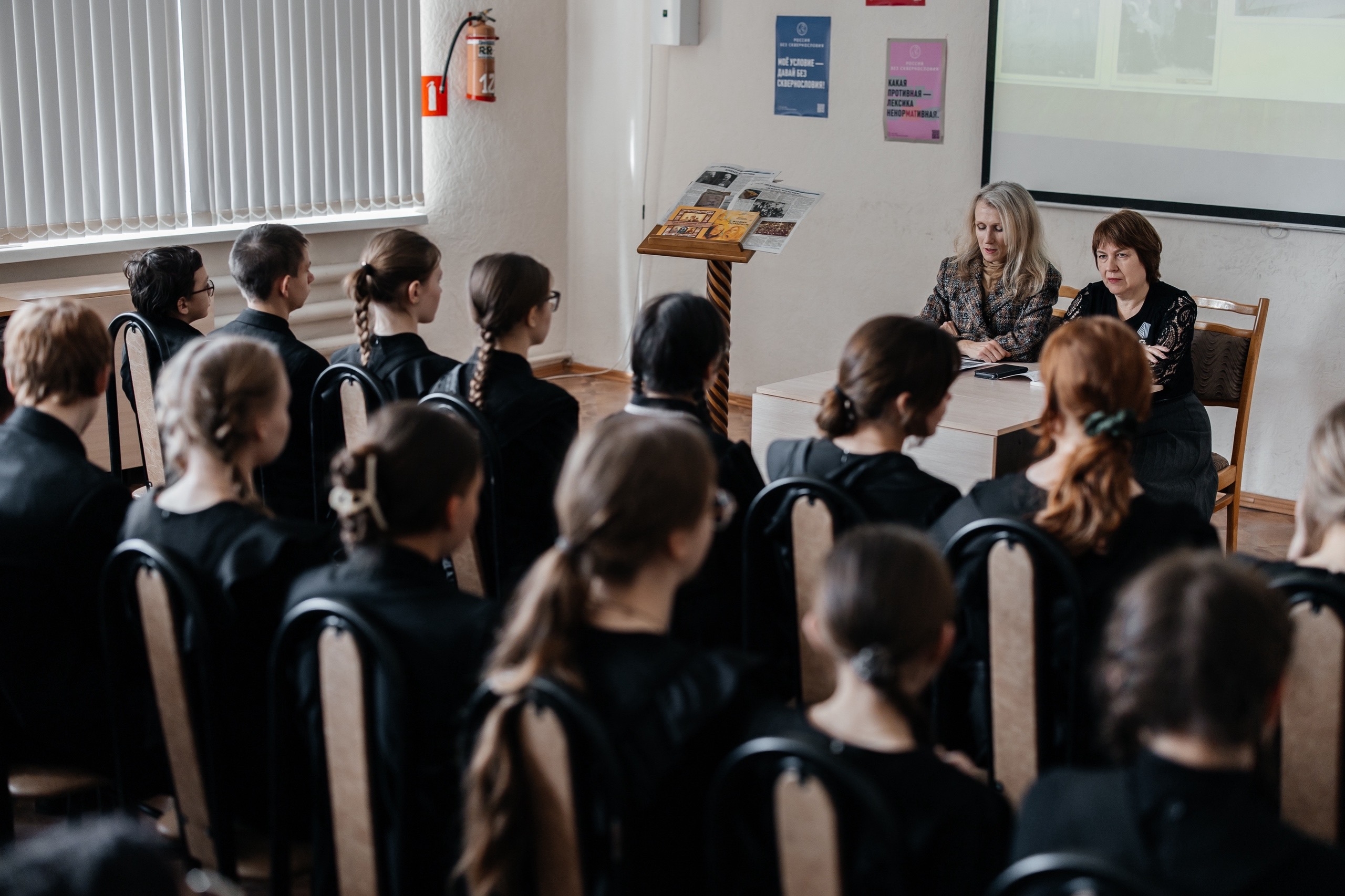 Во время беседы с педагогами и старшеклассниками были затронуты темы чистоты русского языка, празднословия, использования искусственного интеллекта в написании текстов.