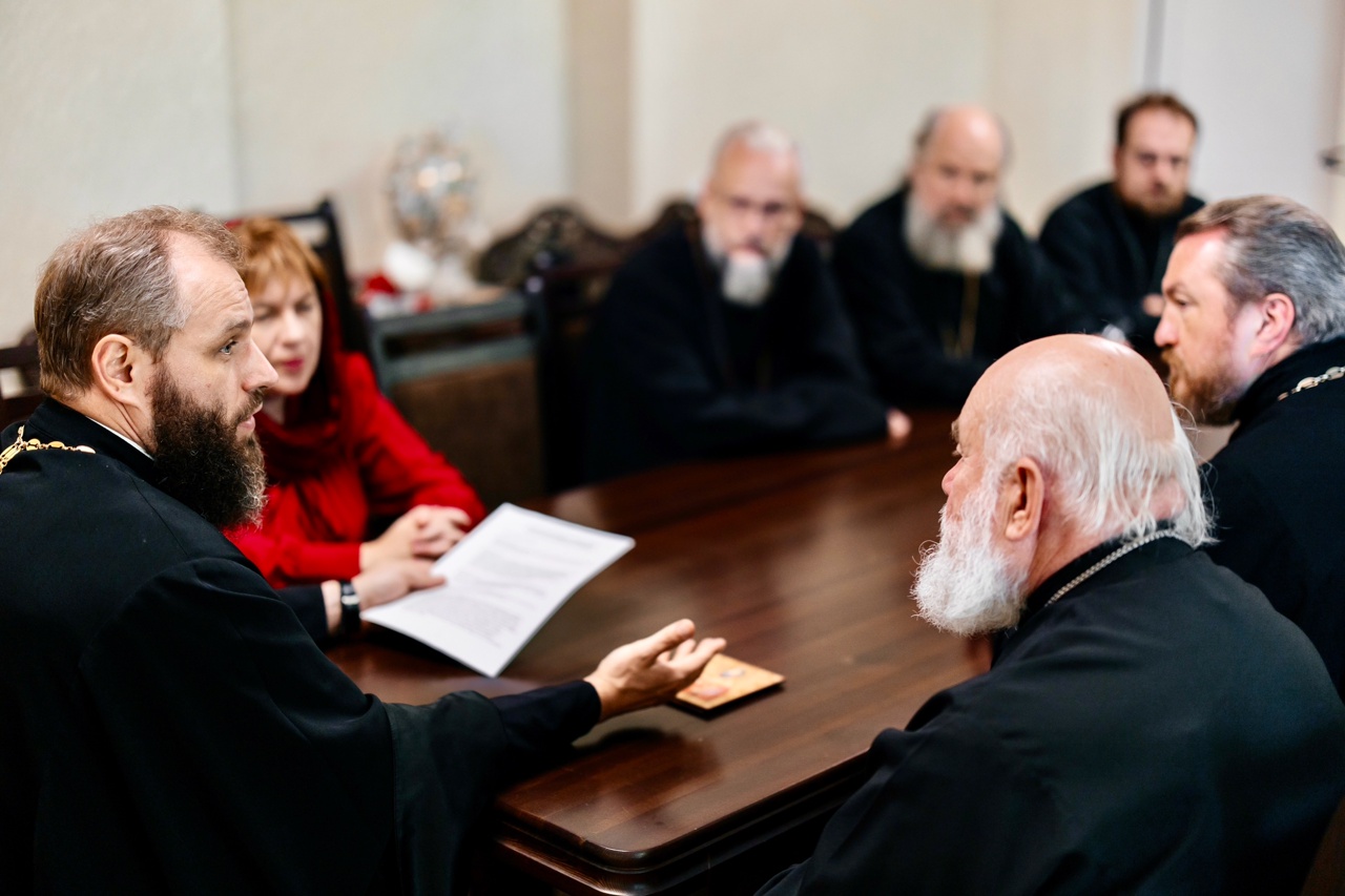 С сообщением о памятных мероприятиях в церковных округах в 2025 году, посвященных 100-летию со дня преставления святителя Тихона, патриарха Московского и всея России, а также участии 5 сентября в рабочей встрече комиссий по организации увековечения памяти и почитания Собора святых Ставропольской митрополии выступил иеромонах Елевферий.
